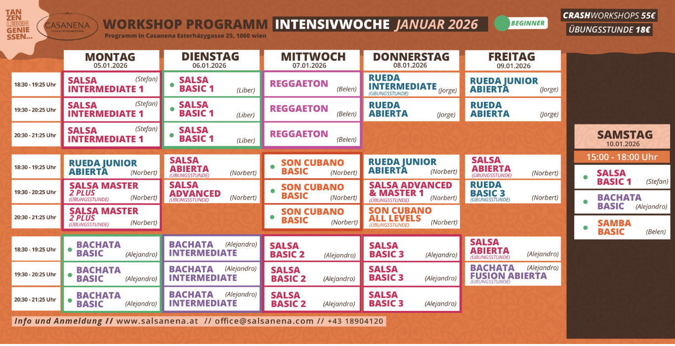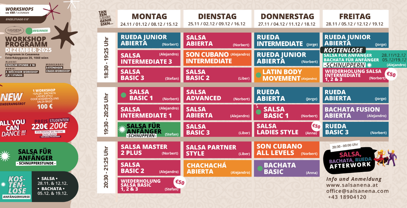 Nicht aufeinander aufbauende Stunden. Du kannst einzelne Tanzstunden und Ruedas besuchen, wenn du schon ein Salmaster bist.
